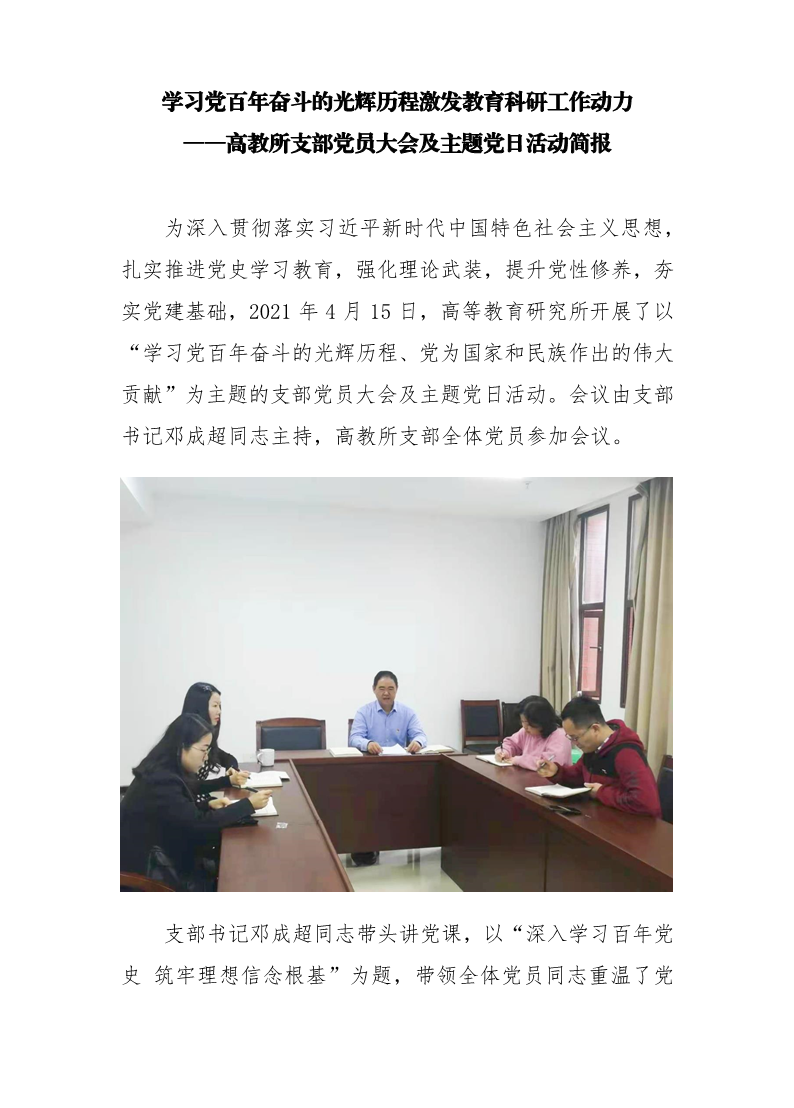 学习党百年奋斗的光辉历程激发教育科研工作动力 ——高教所支部党员大会及主题党日活动简报