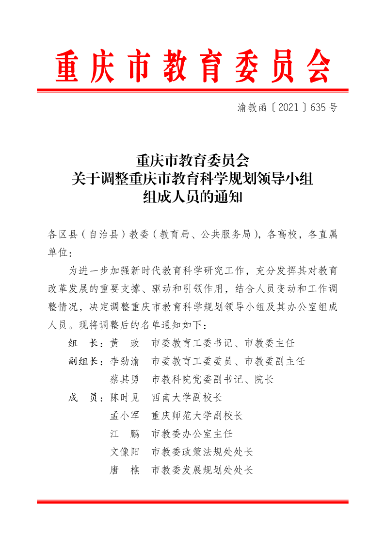 重庆市教育委员会关于调整重庆市教育科学规划领导小组组成人员的通知