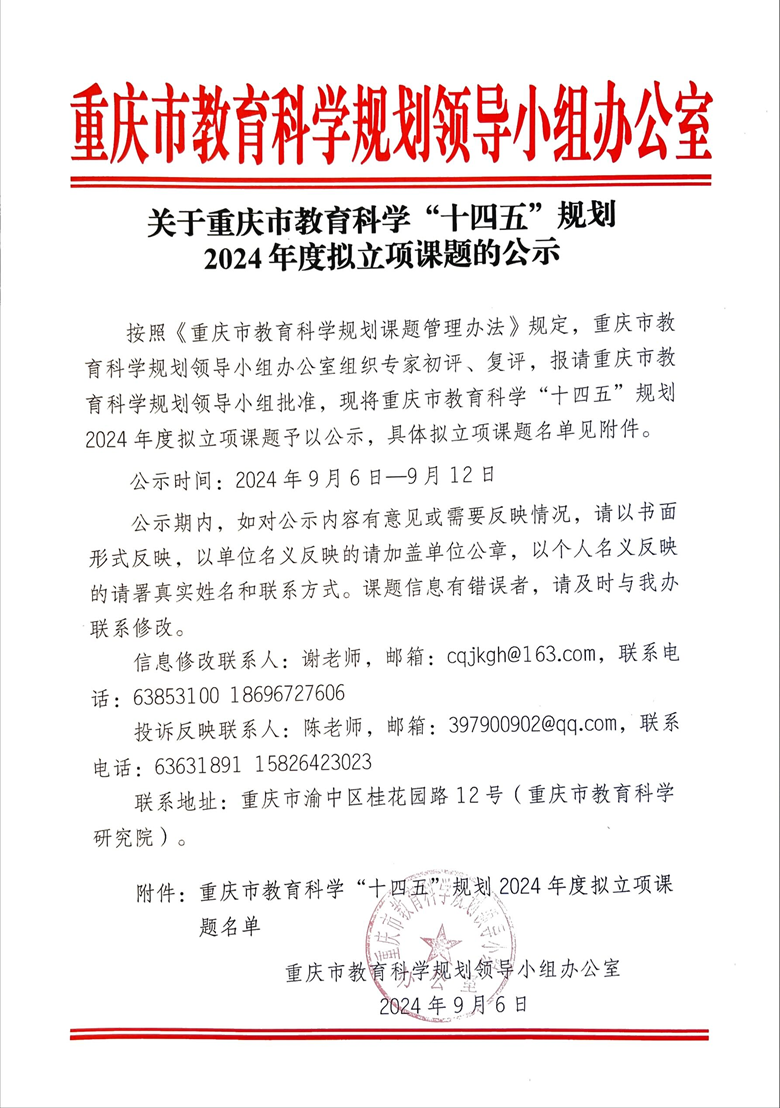 重庆市教育科学规划领导小组办公室关于重庆市教育科学“十四五”规划2024年度拟立项课题的公示