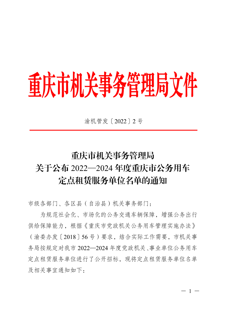 重庆市机关事务管理局关于公布2022—2024年度重庆市公务用车定点租赁服务单位名单的通知