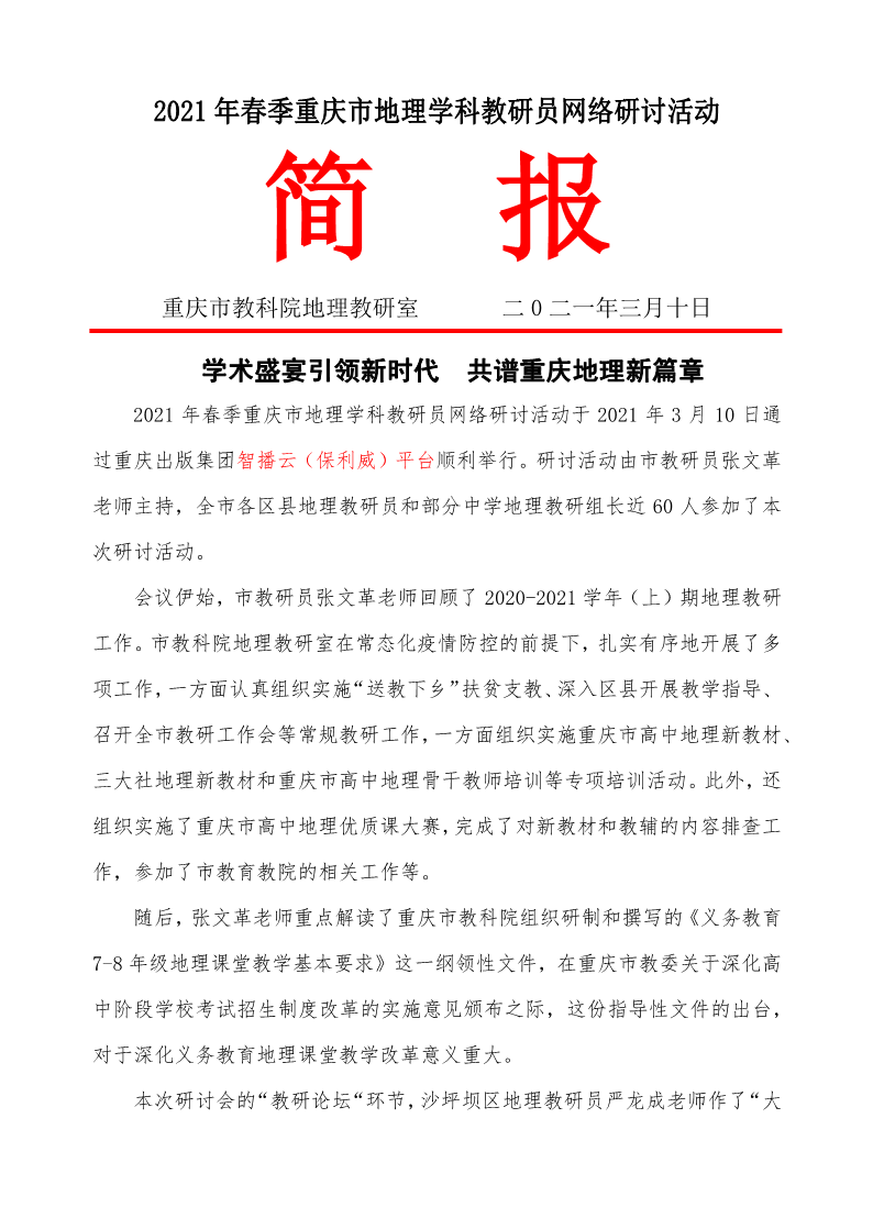 2021年春季重庆市地理学科教研员网络研讨活动简报