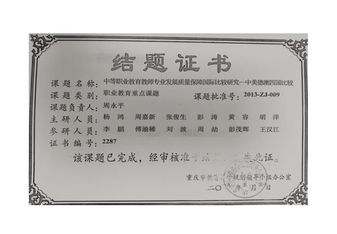 3.重庆市教育规划职业教育重点课题《中等职业教育教师专业发展质量保障国际比较研究——中美德澳四国比较(2013-ZJ-003)》结题 作者: 来源: 发布时间:2022年11月19日 点击数: 次 【字体:小 大】 分享到: 【打印正文】