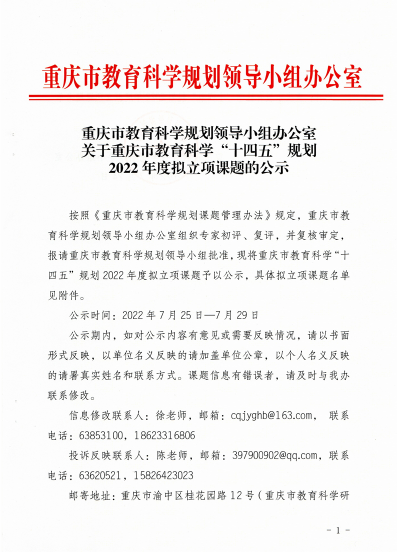 重庆市教育科学规划领导小组办公室关于重庆市教育科学“十四五”规划2022年度拟立项课题的公示