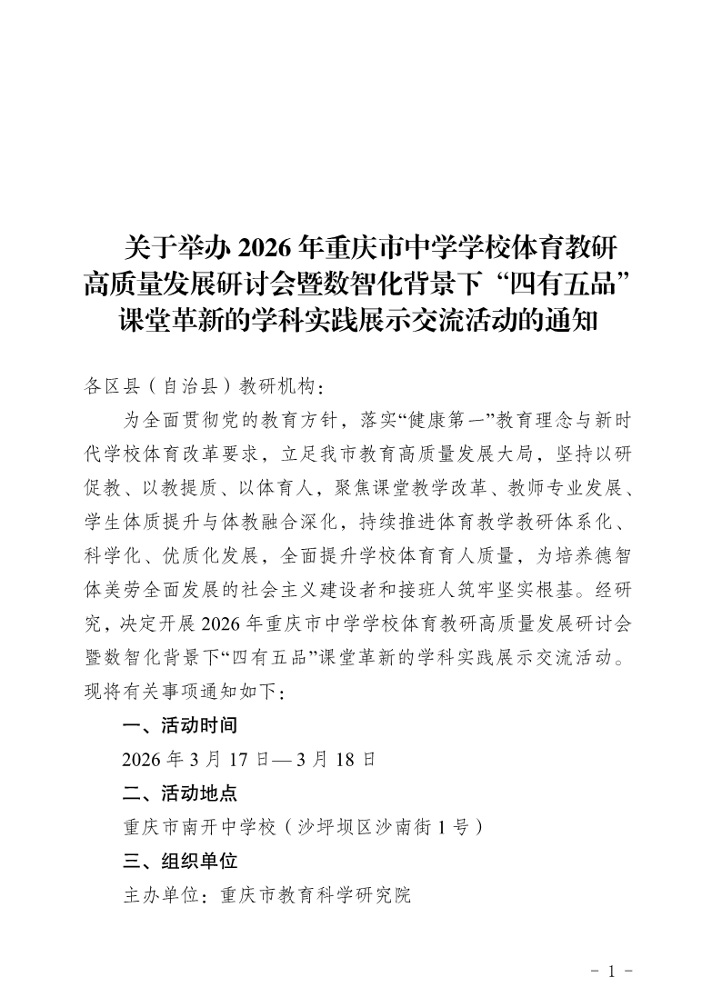 关于举办2026年重庆市中学学校体育教研高质量发展研讨会暨数智化背景下“四有五品” 课堂革新的学科实践展示交流活动的通知